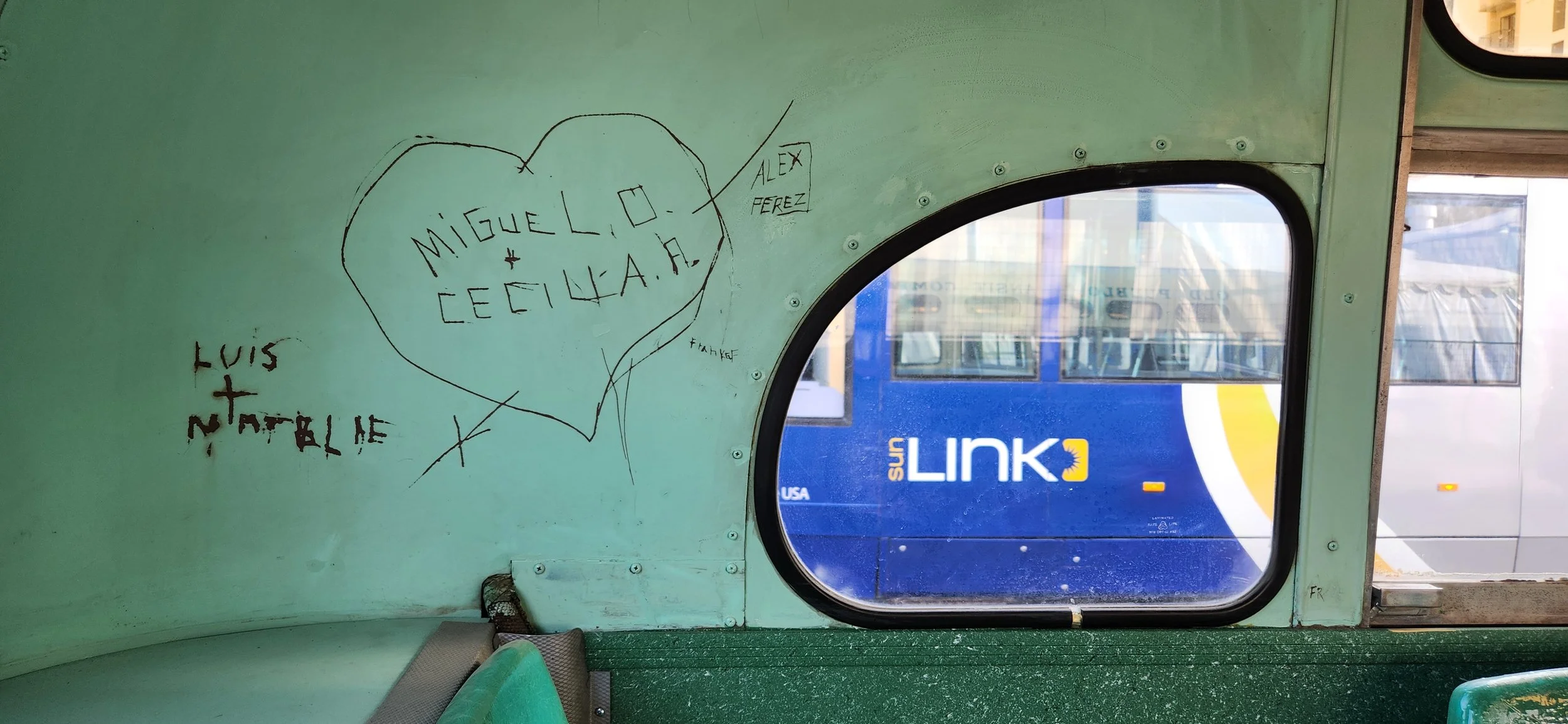 1970s-era graffiti at the rear of #135 with a Sun Link streetcar in the background, 2024