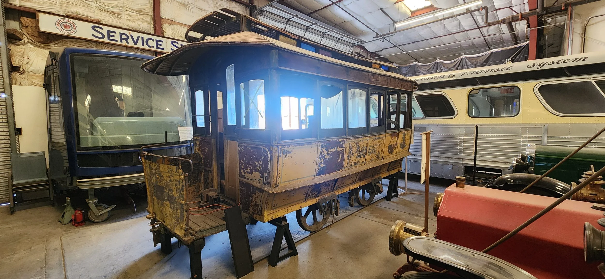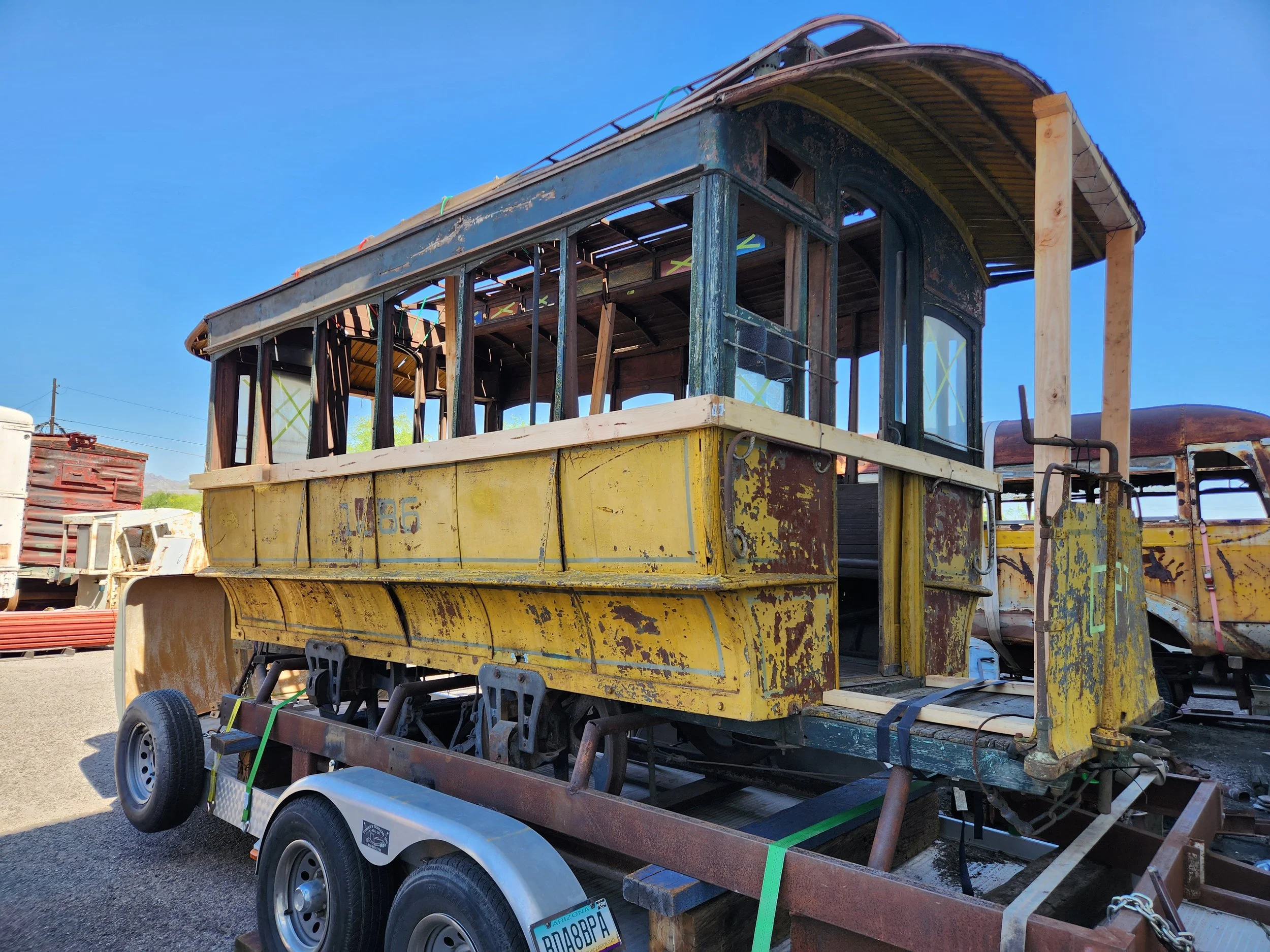 San Antonio streetcars ran on 4-foot gauge track. On initial investigation, it appears the wheels can readily be moved out on the axles enough to convert it to standard gauge. At this time, its structural integrity is undetermined and will require extensive investigation. Future restoration plans, if possible, are to replicate a mule-car that ran in Tucson around the turn of the 20th century.